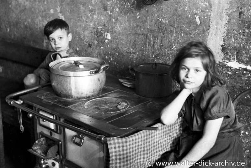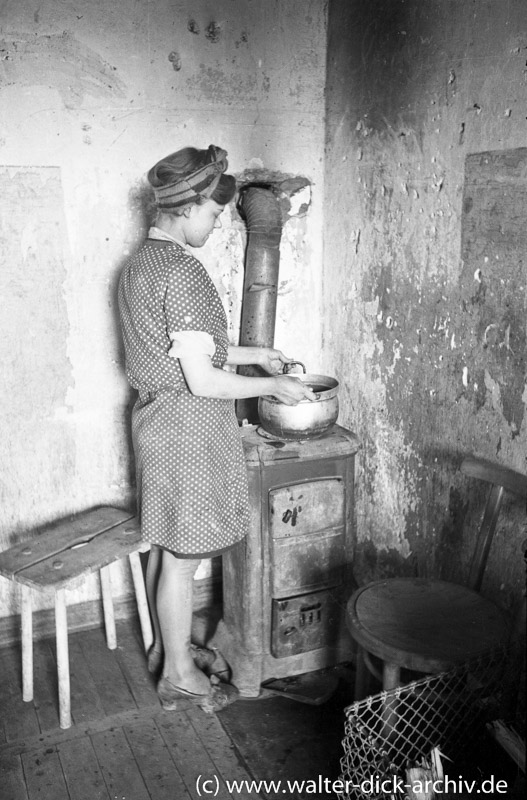 Und das Geld verlor immer mehr an Wert. In den letzten Monaten vor der Währungsreform kostete ein Eimer Rübenkraut 500 Mark und ein Pfund Butter 300. Rudolf Koller verdiente bei der Deutschen Bank damals 800 Mark im Monat. Schließlich machte er Schulden, am Tag vor der Währungsreform waren sie auf 100 000 Mark angewachsen, am Tag danach betrugen sie noch 10 000. Acht Wochen vor der Reform war in den Geschäften praktisch nichts mehr zu erhalten, erinnert sich Rudolf Kollers Sohn Rolf. ,,Danach war schlagartig alle Ware da. Das habe ich nie vergessen." Die Eltern gingen mit den Kindern sofort zu Hettlage und Kämpgen, kauften Kleider und Schuhe. ,,Aber was", fragt sich Rolf noch heute, ,,haben die Leute gemacht, die nicht so viel Geld hatten und keine Schulden machen konnten?" Eine Antwort gibt Hildegard Menge, wie Hildegard Volk heute heißt, die einen damals 18jährigen Altersgenossen zitiert: ,,Koche kann ich och! Ävver us nix jet mache, wie ming Mutter, dat kann ich nit." (Kochen kann ich auch! Aber aus nichts etwas machen, wie meine Mutter, das kann ich nicht.)