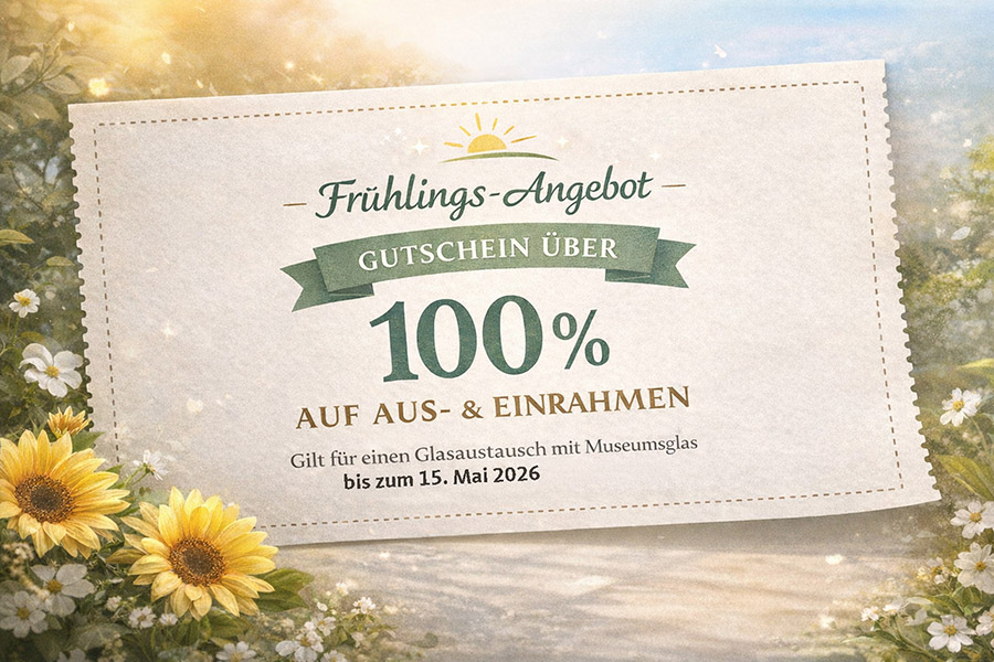 Sie erhalten bis zum 15. Mai einen Gutschein von 100% auf die Arbeitsleistung unserer Werkstatt, für Ausrahmung, Entsorgung Ihres alten Glases und Einrahmung mit neuem Museumsglas. Sie bezahlen nur den Preis für das neue Museumsglas! Den Gutschein können Sie hier als PDF downloaden.