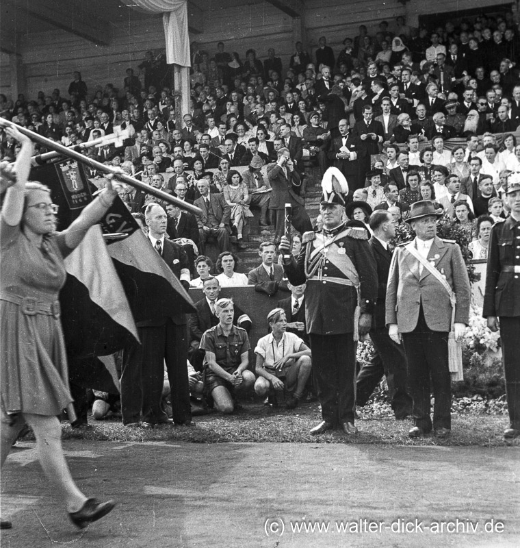 Die Abordnungen der vielen kirchlichen Vereine, Organisationen und Einrichtungen, die zu der großen 700 Jahr Feier nach Köln gekommen waren, zogen mit ihren Fahnen an der Tribüne des Kölner Stadions vorbei, auf der sich die Ehrengäste, allen voran Bischöfe, Kardinäle und andere hohe Würdenträger versammelt hatten.