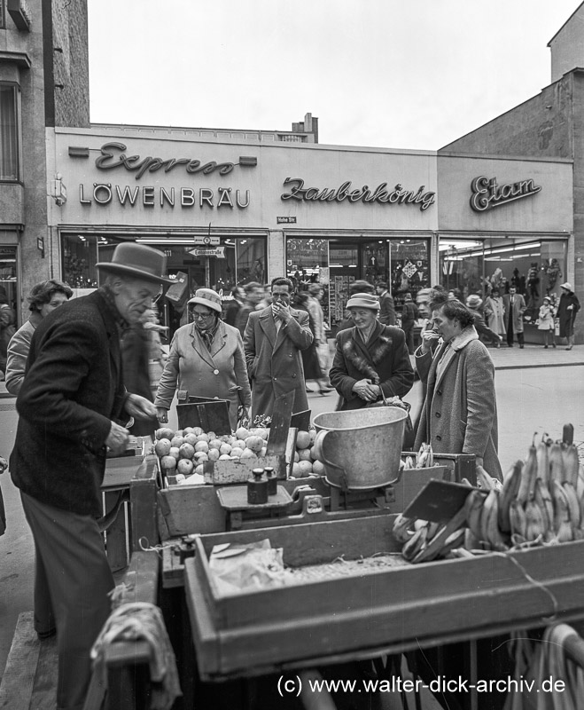 Der Obsthändler, mit Hut und schwarzem Jackett korrekt gekleidet, hatte es Walter Dick wohl besonders angetan. Er hat ihn in einer kleinen Serie gewürdigt, von der wir fünf Fotos im Archiv veröffentlicht haben. Wahrscheinlich war der Mann damals das, was man als "Original" bezeichnet, vielleicht immer mit einem guten Spruch oder Ratschlag für die Kundinnen.