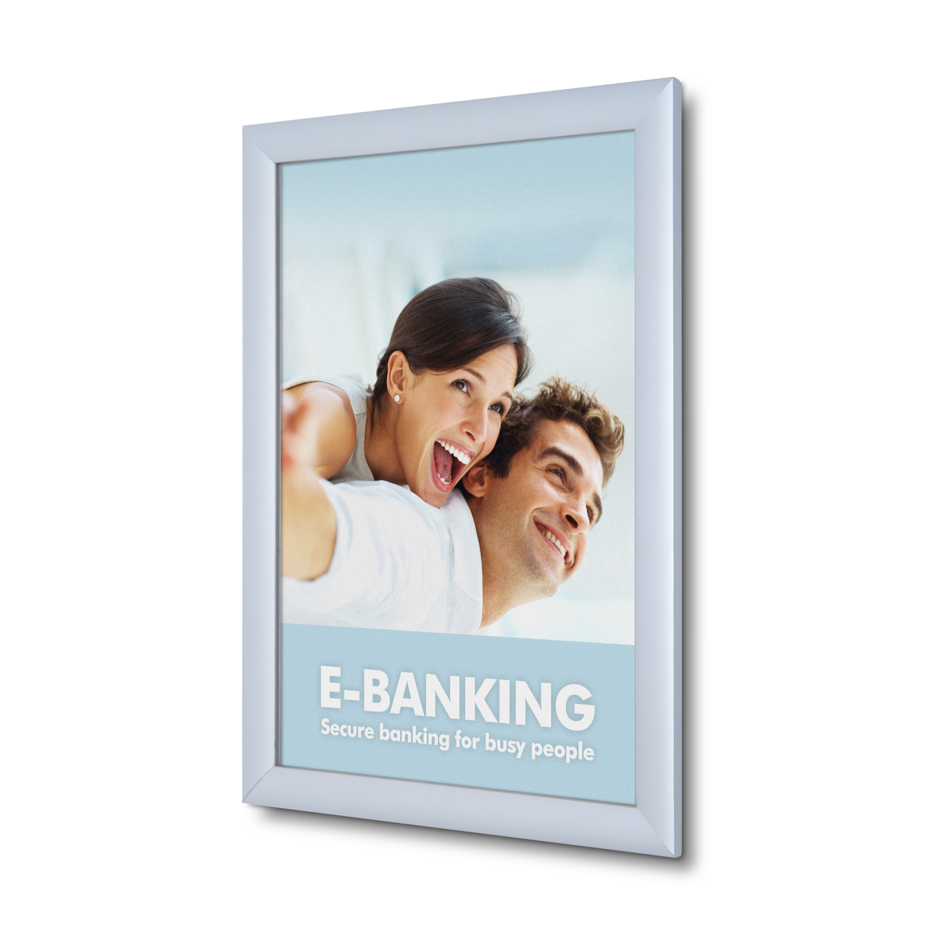 Perfekt für 1mm starke Plakate. Zwei Eckvarianten stehen außerdem für Sie zur Auswahl: der Gehrungsschnitt oder die dekorative Variante mit abgerundeten, hochglänzenden Stahleckverbindern (Rondo).
