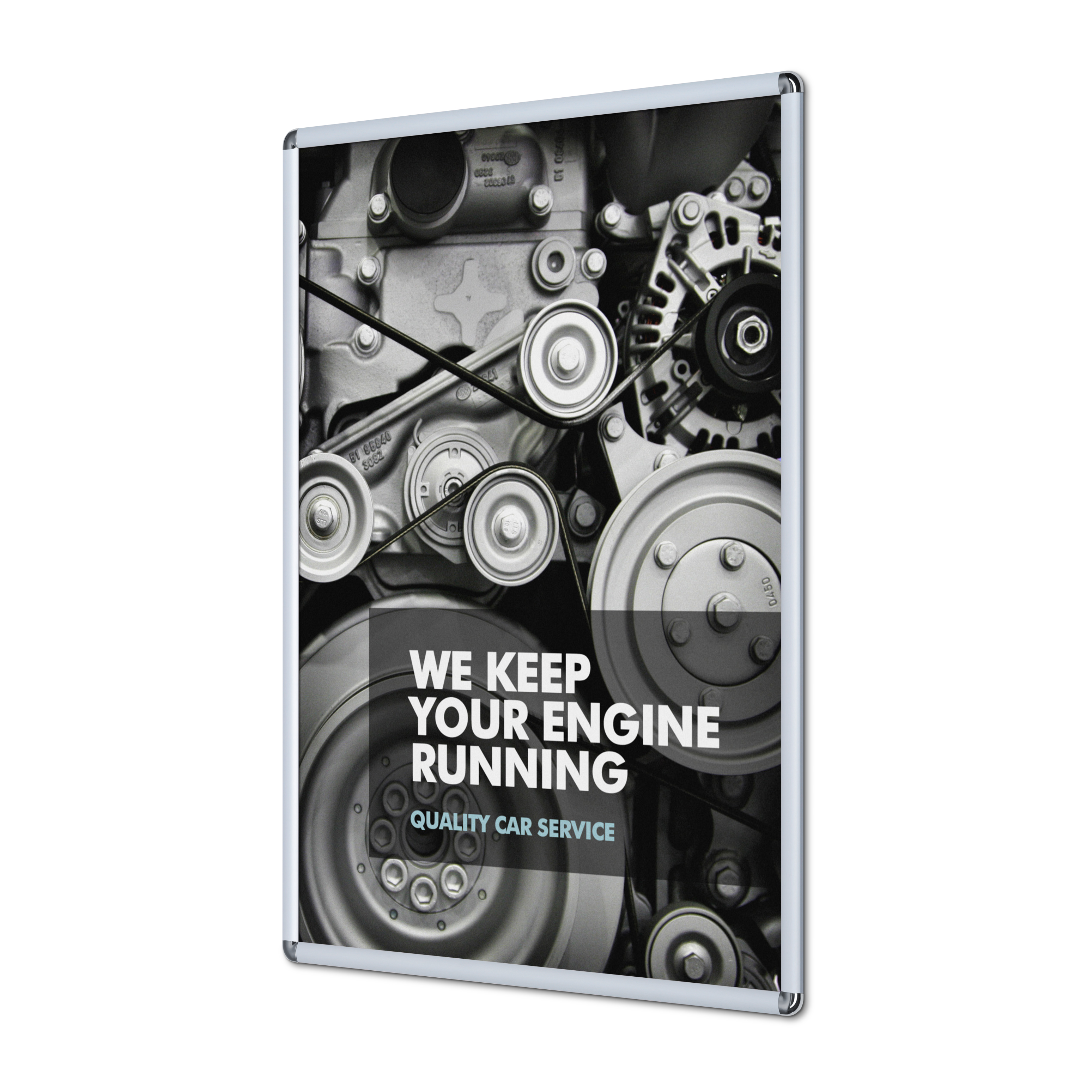 Perfekt für 1mm starke Plakate. Zwei Eckvarianten stehen außerdem für Sie zur Auswahl: der Gehrungsschnitt oder die dekorative Variante mit abgerundeten, hochglänzenden Stahleckverbindern (Rondo).