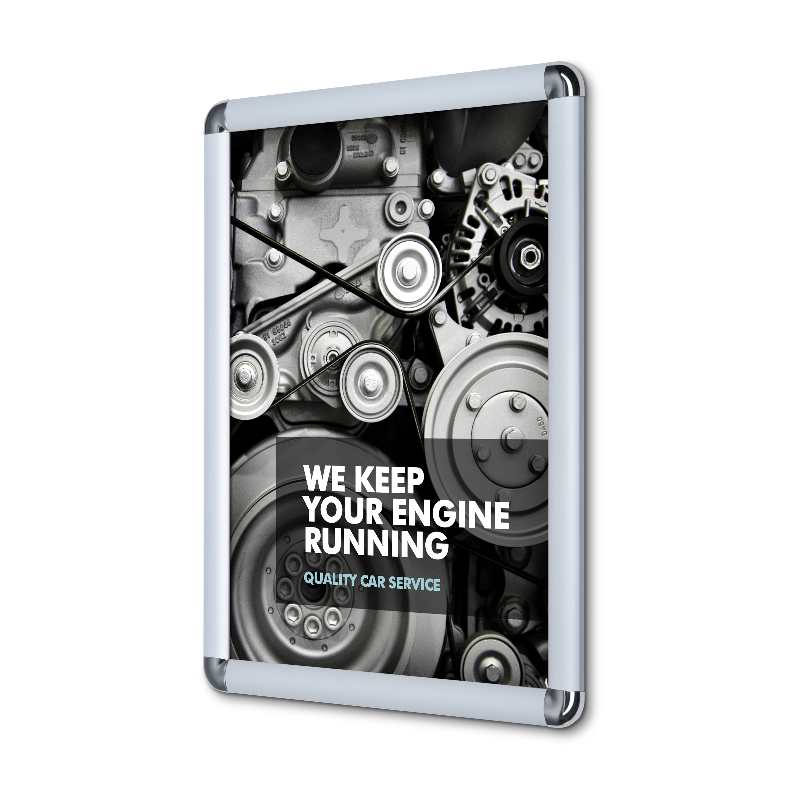 Perfekt für 1mm starke Plakate. Zwei Eckvarianten stehen außerdem für Sie zur Auswahl: der Gehrungsschnitt oder die dekorative Variante mit abgerundeten, hochglänzenden Stahleckverbindern (Rondo).
