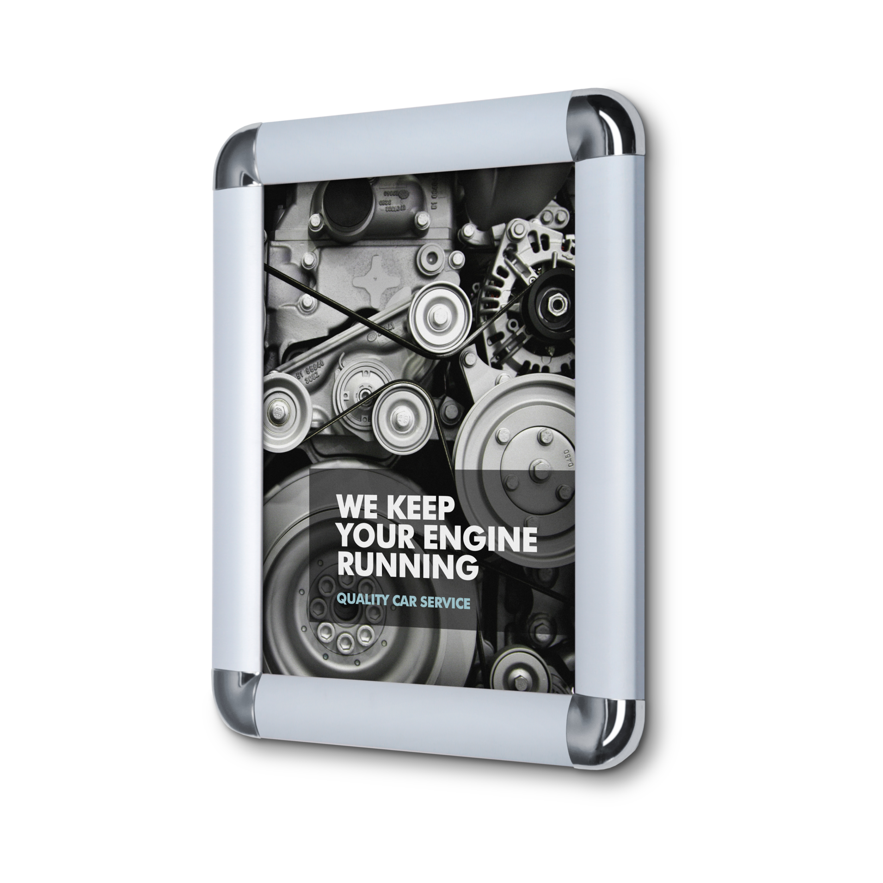 Perfekt für 1mm starke Plakate. Zwei Eckvarianten stehen außerdem für Sie zur Auswahl: der Gehrungsschnitt oder die dekorative Variante mit abgerundeten, hochglänzenden Stahleckverbindern (Rondo).