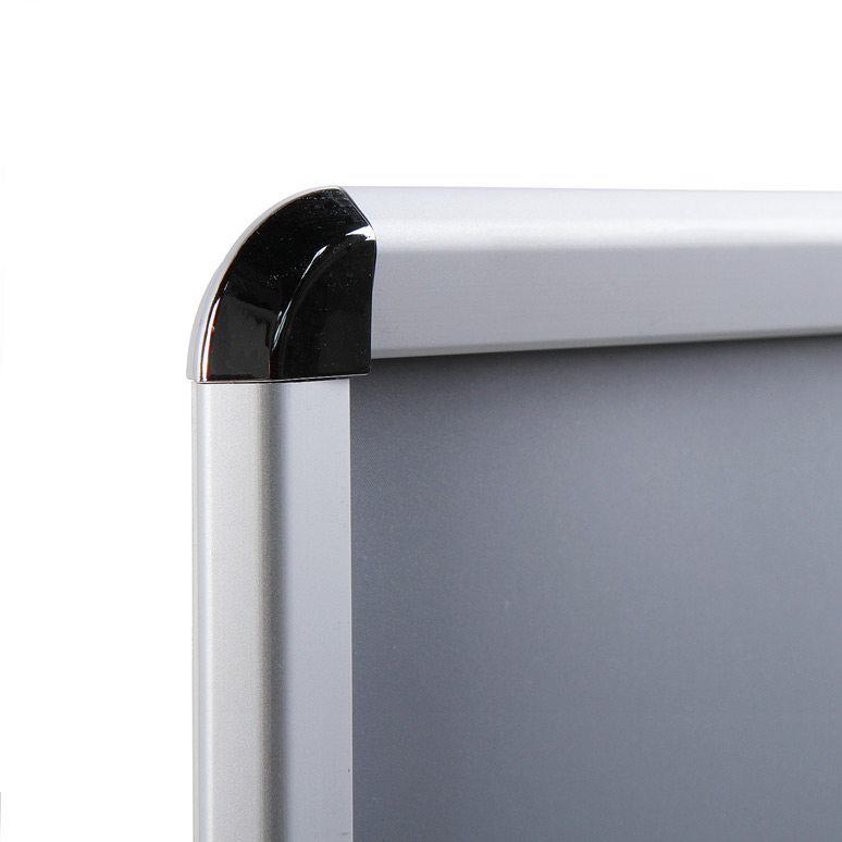 Perfekt für 1mm starke Plakate. Zwei Eckvarianten stehen außerdem für Sie zur Auswahl: der Gehrungsschnitt oder die dekorative Variante mit abgerundeten, hochglänzenden Stahleckverbindern (Rondo).