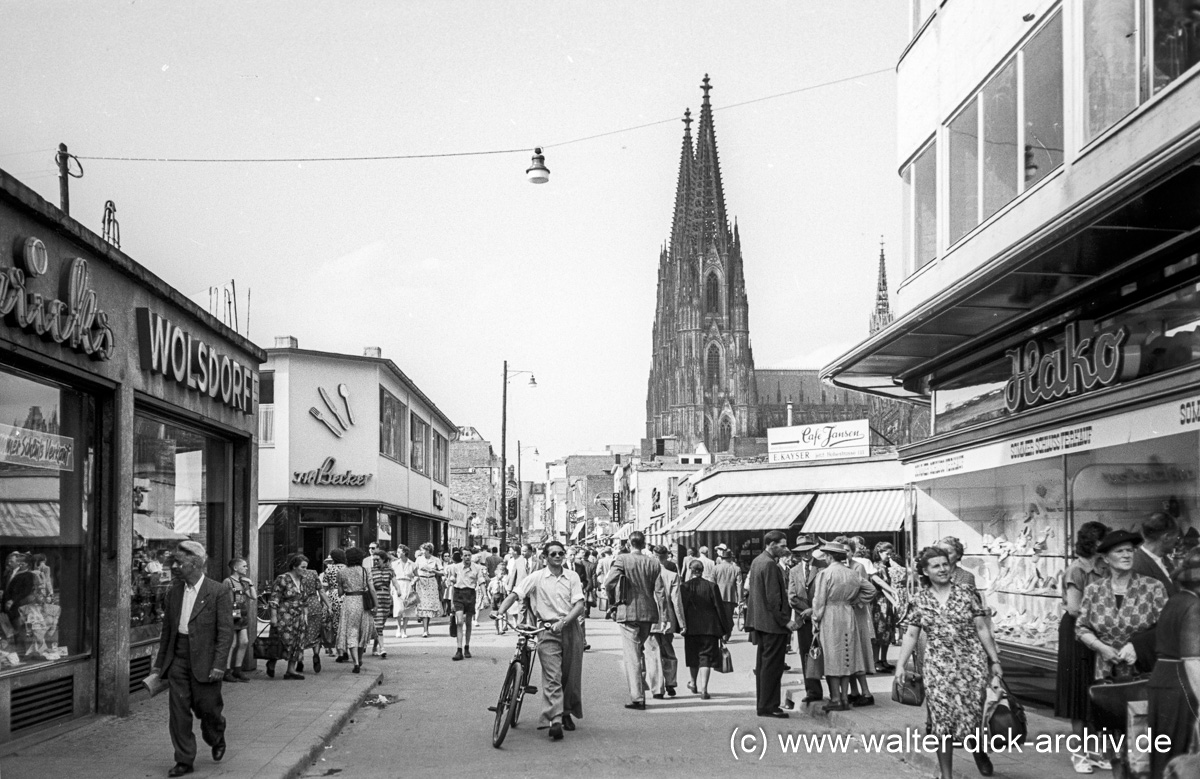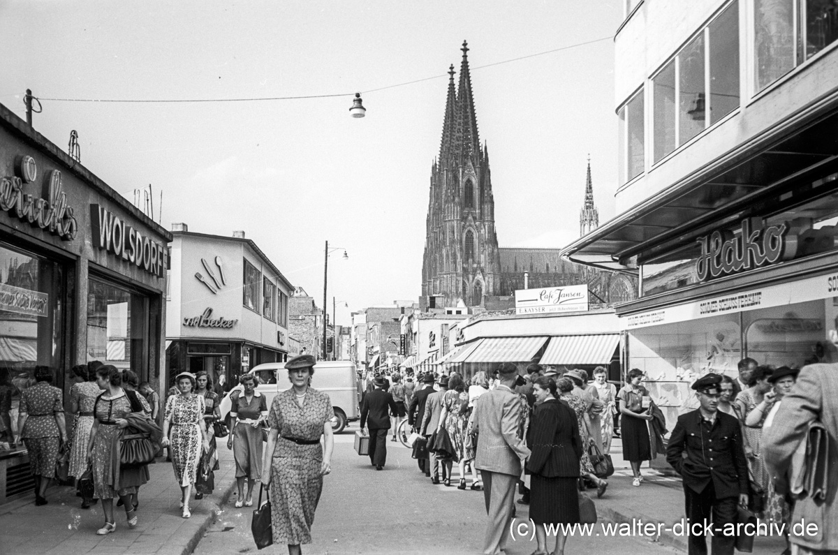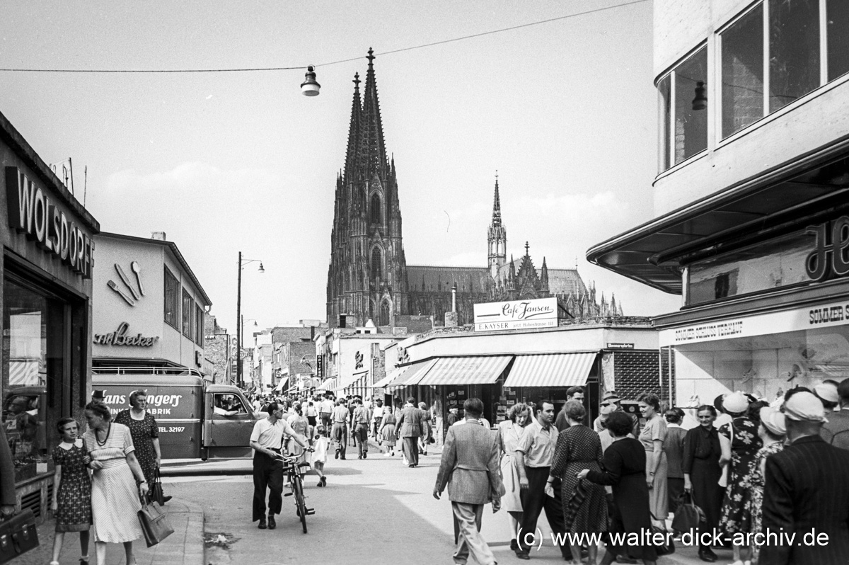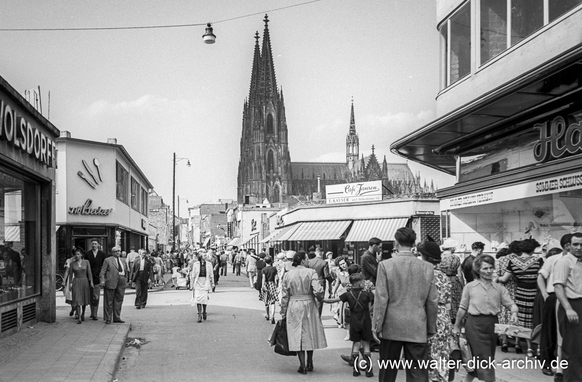 Von der Ecke der Hohe Straße mit der Straße "Obenmarspforten"(re.) und der Brückenstraße (li.) aus hat Walter Dick die Hohe Straße in Richtung Norden fotografiert. Walter Dick hat immer wieder in verschiedenen Jahren von vergleichbaren Aufnahmeorten aus Fortschritt und Zustand des Wiederaufbaus dokumentiert.
