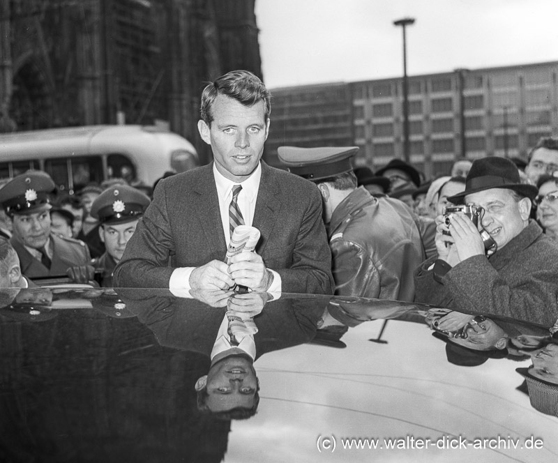 Robert Francis "Bobby" Kennedy (1925-1968) war der jüngere Bruder des ermordeten amerikanischen US-Präsidenten John F. Kennedy. Er besuchte im Juni 1964 mit seiner Ehefrau Ethel Skahel Köln. Zusammen mit Oberbürgermeister Theo Burauen besuchten die Kennedys u.a. den Dom und das Rathaus, wovon hier Fotos gezeigt werden. Es scheinen die einzigen Fotos von diesem Besuch zu sein, die heute noch verfügbar sind.