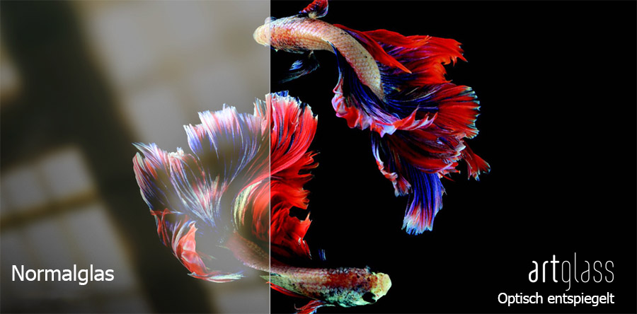 Höchste Qualitätsstufe für störungsfreies Betrachten der Kunst. Spiegelungen werden durch bedampfte Oberfläche auf unter 1% gemindert (70% UV Schutz). Unsere Empfehlung.