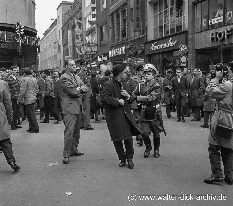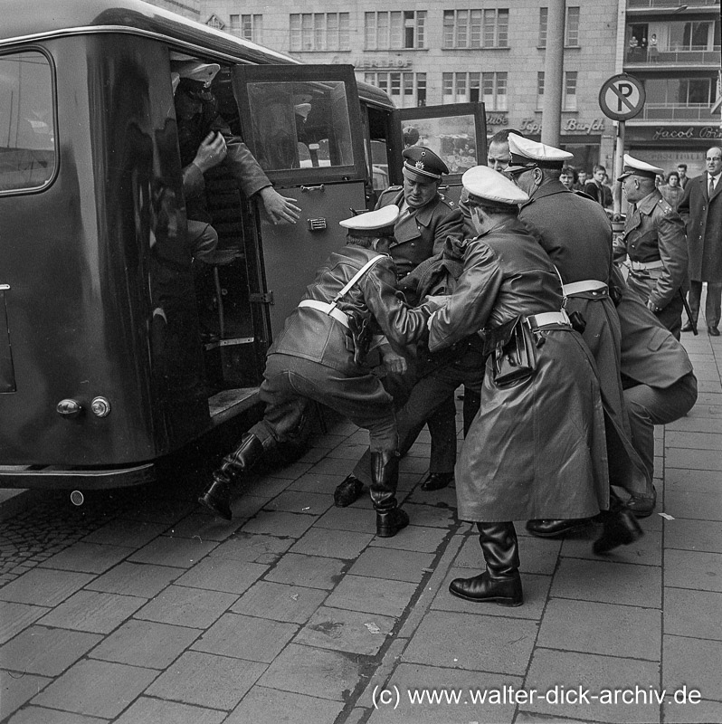 Zu dieser Bilderserie lauten die Aufzeichnungen auf der Negativtasche:"Polizei: Perserdemonstration 60er Jahre; ggf. 1967. Es kann davon ausgegangen werden, dass es sich um Demonstrationen persischer Studenten handelt, die zusammen mit deutschen Kommilitonen zum einen gegen den Besuch des Schah und gegen die Unterdrückung im Iran protestieren, zum anderen um Demonstrationen gegen den Todesschuss eines Berliner Kriminalbeamten gegen den Studenten Benno Ohnesorg in Berlin am 2. Juni 1967. Die Tötung des Studenten und die darauf folgenden Proteste können als der Beginn der 68er Bewegung angesehen werden.