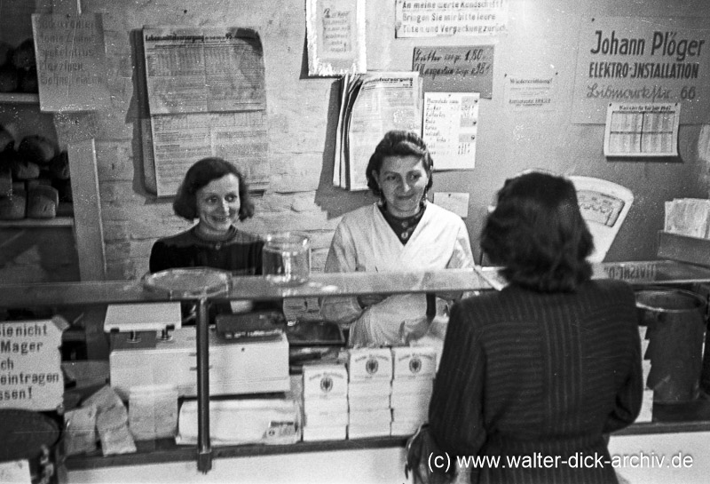 Die beiden Damen bedienen, wie damals üblich, ihre kundin über die Theke. Vor den Zeiten von Selbstbedienung wurden alle Verkäufe über die Theke abgewickelt. Die Kundin nannte ihren Wunsch, die Verkäuferin reichte das Gewünschte über die Theke, notierte den Preis auf einem Papierblöckchen und wenn die Kundin alles bekommen hatte, wurden die Preise auf dem Blöckchen meist von Hand addiert und es konnte bezahlt werden. Bis in die 50er Jahre wurden Grundnahrungsmittel, Zucker, Mehl, etc. noch von Hand abgewogen und einzeln in Tüten abgepackt.