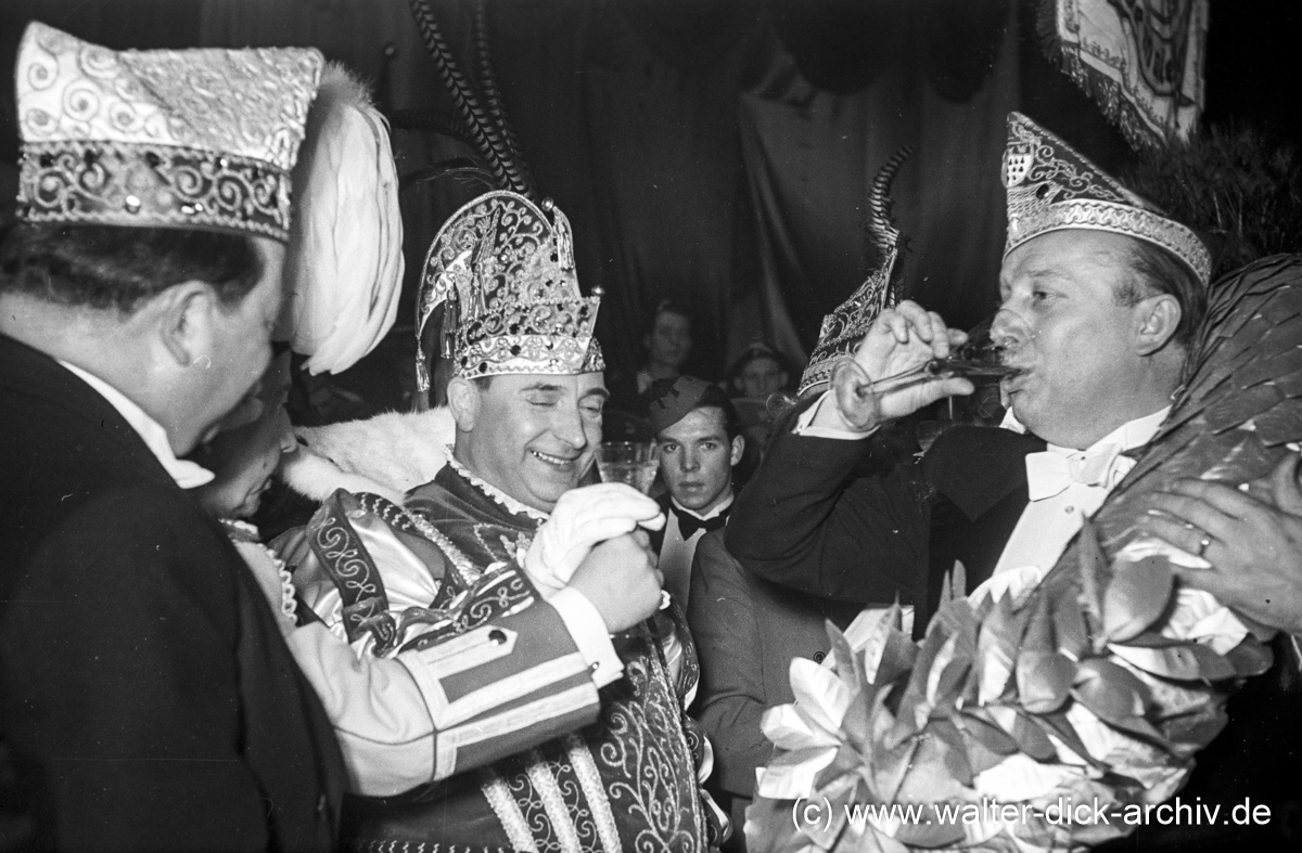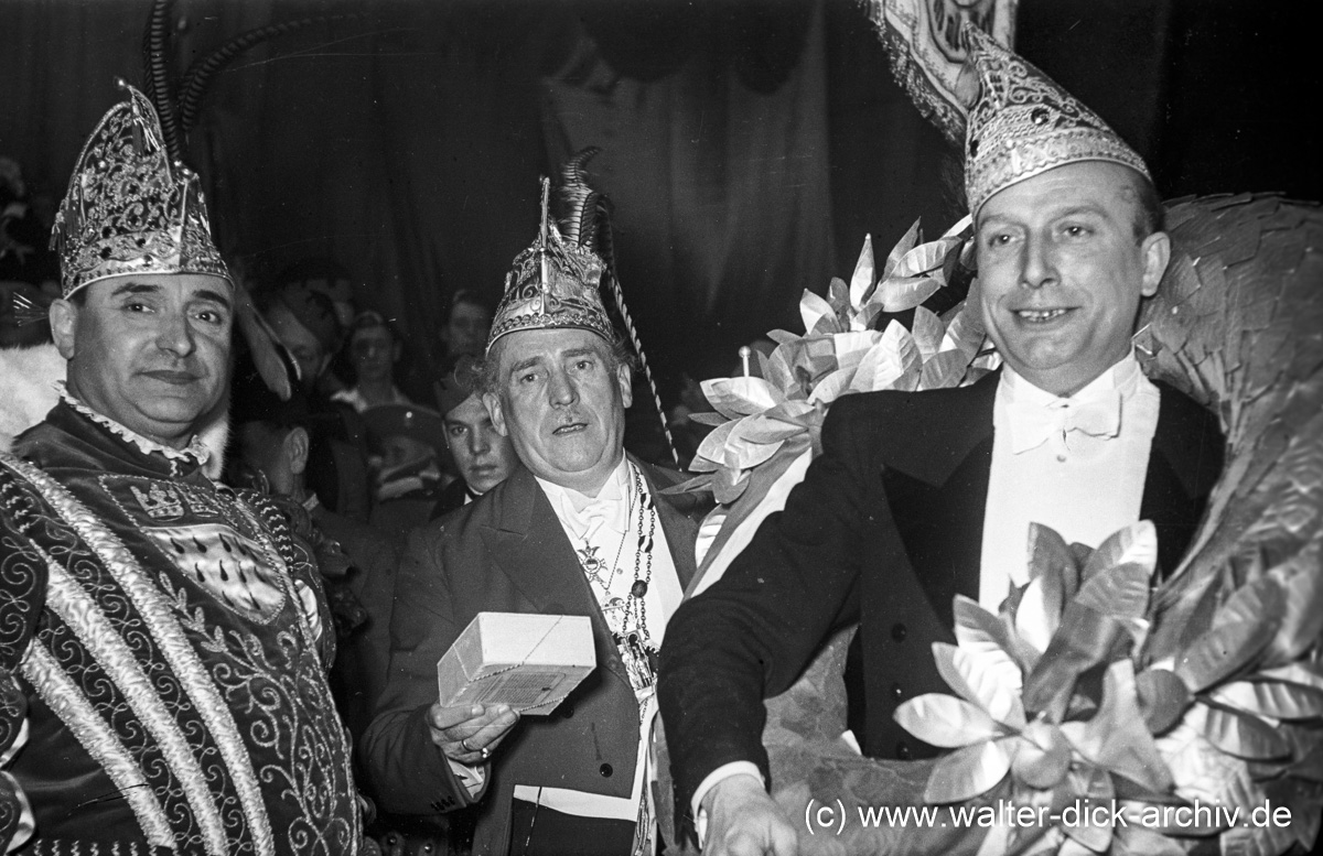 Auf der Schärpe des Lorbeerkranzes, den Karl Berbuer sich um den Hals geworfen hat, erkennt man das Datum, 8.2.1950. Das Datum markeirt das 25jährige Jubiläum seines ersten Auftritts im Kölner Karneval. Berbuer war in der ersten Hälfte des 20. Jhdts. und bis in die 70er Jahre neben Willi Ostermann wohl der bekannteste und erfolgreichste Sänger, Texter und Komponist von Liedern nicht nur für den Karneval. Er schrieb und sang nicht nur kölsche Lieder und Couplets sondern bediente auch den Zeitgeschmack mit Rhein- und Weinliedern,