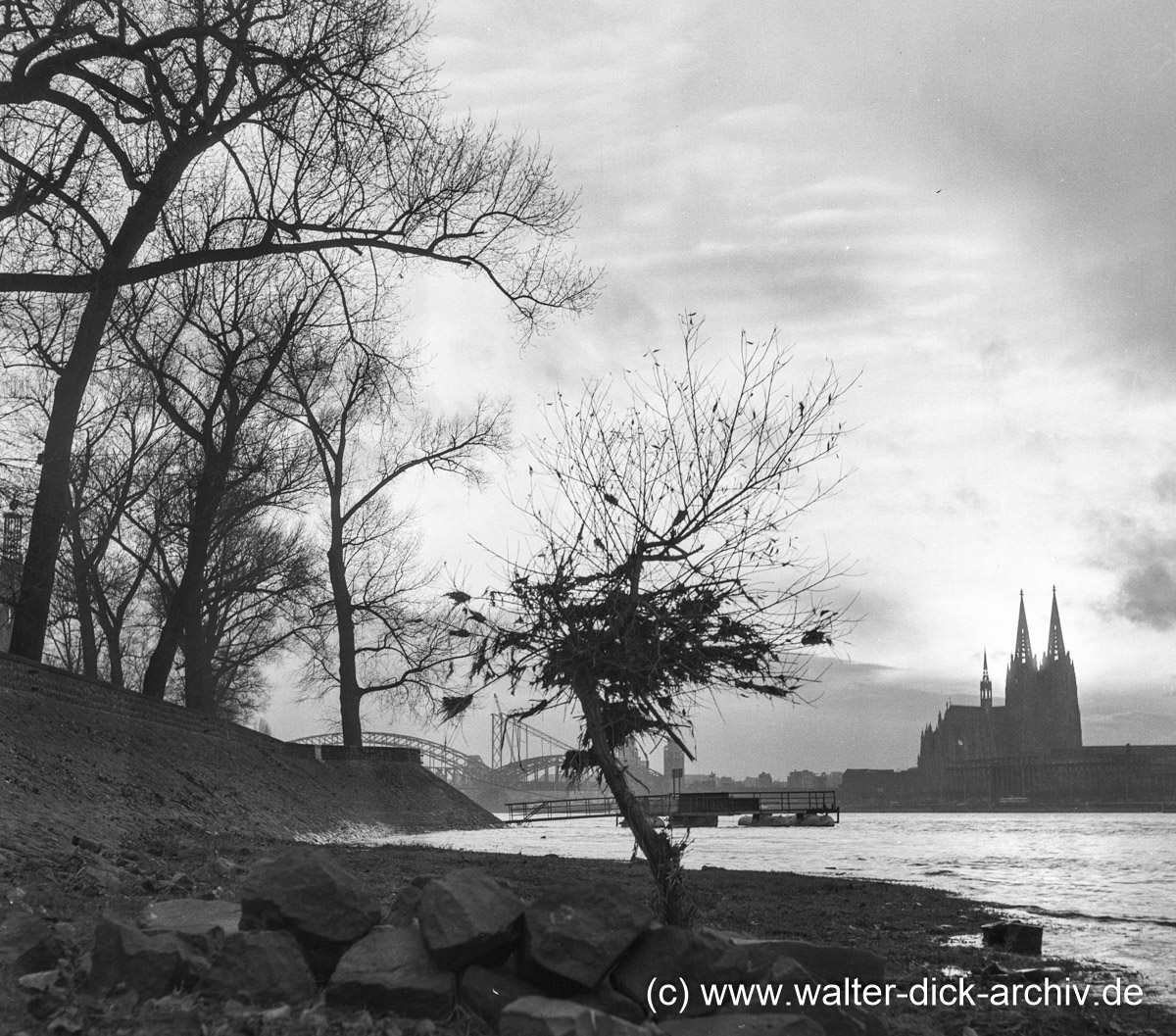 Bei der Datierung dieses Fotos hilft ein genauer Blick durch die Baumgruppe links auf die Hohenzollernbrücke. An der Brücke erkennt man, dass da noch das provisorische, kastenförmige Mittelteil besteht. Diese Bauteil aus dem jahre 1948 wurde erst 1952 durch eine neue Bogenkonstruktion ersetzt.