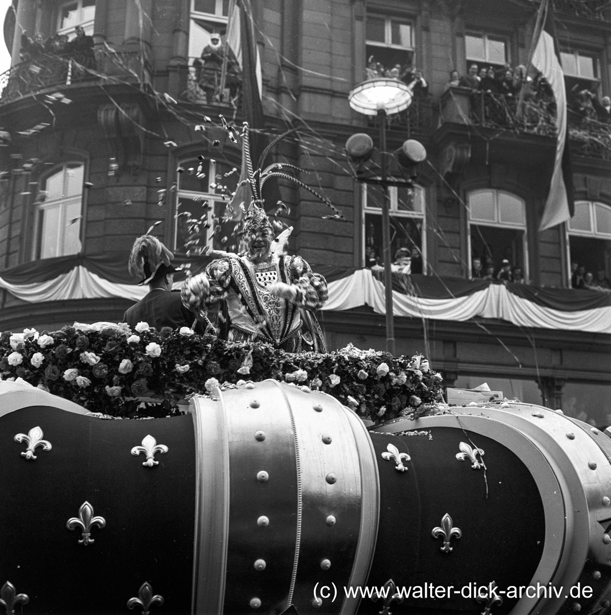 Das Foto zeigt, dass der prächtige Prinz eine regelrechte Wolke von Kamelle über die jubelnden Narren regnen lässt.