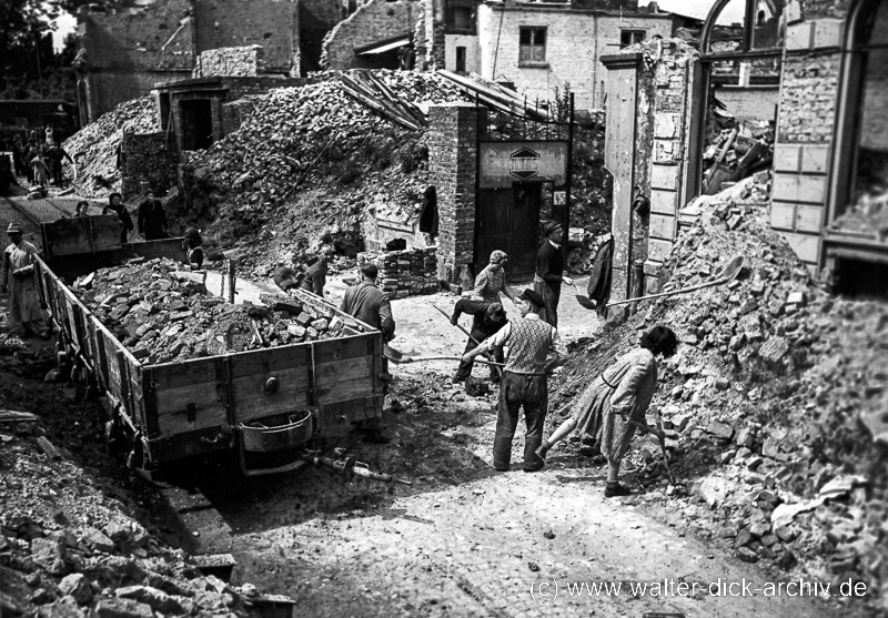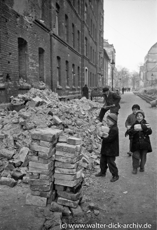 Das Trümmerräumen war nicht nur notwendig, um Straßen und Bauplätze freizubekommen; die Hausruinen bildeten eine ständige Gefahr, wenn sie nicht entweder gesichert oder abgerissen wurden. Hildegard Volk ging einmal mit ihrer Freundin von der Schule nach Hause. An der Alteburger Straße in Köln-Bayenthal stürzte ein Giebel ein, als sie gerade vorbeikamen. ,,Ich weiß noch, daß ich um mein Leben gerannt bin und gar nicht daran gedacht habe, daß meine Freundin vielleicht unter den Trümmern liegen könnte. Dafür habe ich mich dann sehr geschämt." Der Freundin war aber nichts geschehen.