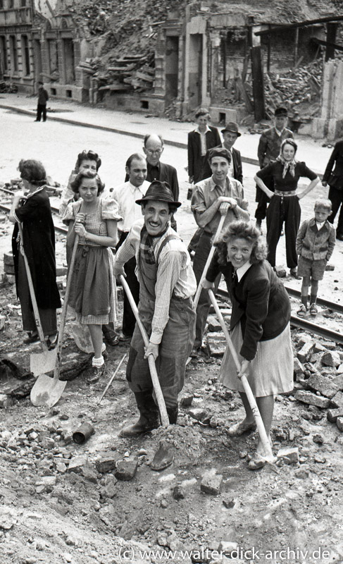 Es gab Trümmerfrauen, Trümmermänner und Trümmerkinder. Melitta Moreno schippte am Kölner Klingelpützz, Heinz Breuer an der Trajanstraße, Ecke Ubierring, und Hildegard Volk dreimal in Bayenthal. Sie war damals gerade 16 und mußte wie ihre ganze Schulklasse Schutt in Lorenzüge laden. ,,Es war zwar anstrengend", sagt sie, ,,aber es hat eigentlich Spaß gemacht. Wir hatten ja schulfrei dafür." Auch die Schwestern von Frau Kohlhof, 14 und 18 Jahre alt, wurden zum Steineklopfen in die Trümmer beordert. Die Mutter, die schon recht alt war und so viele Kinder zu versorgen hatte, wurde verschont.