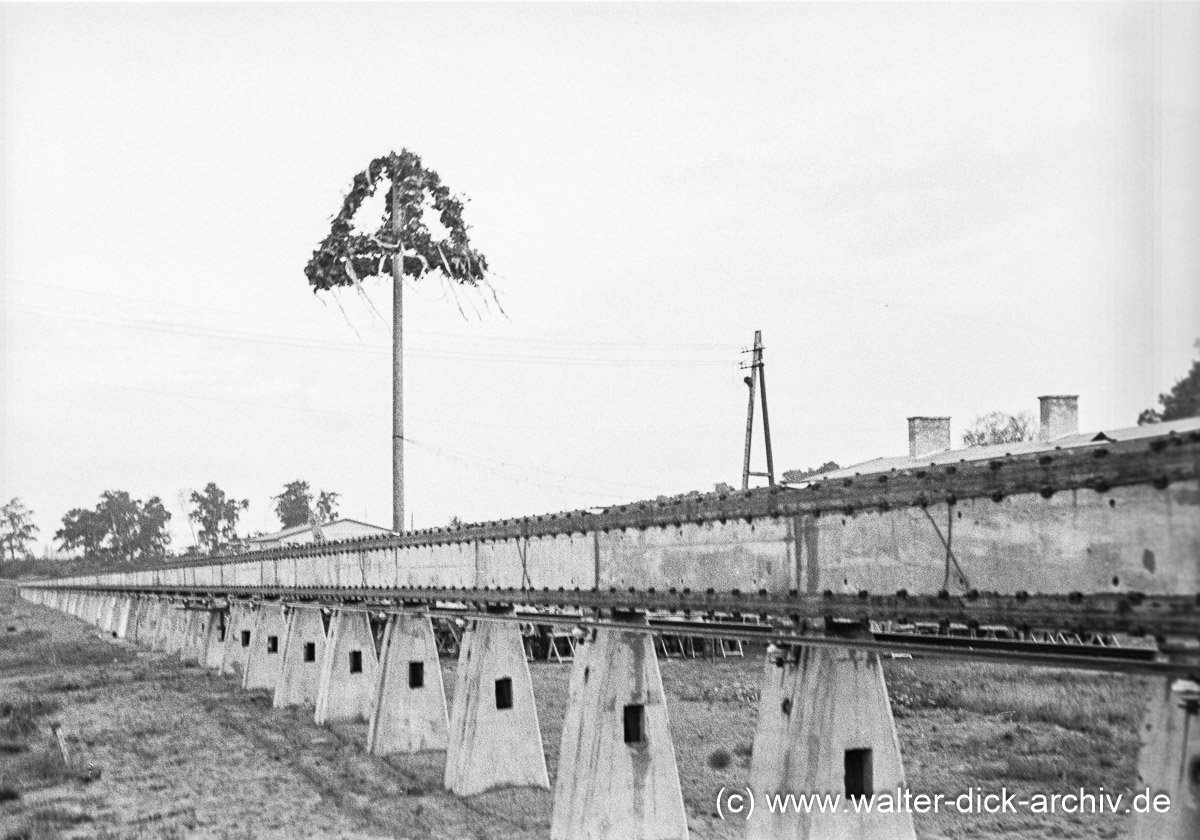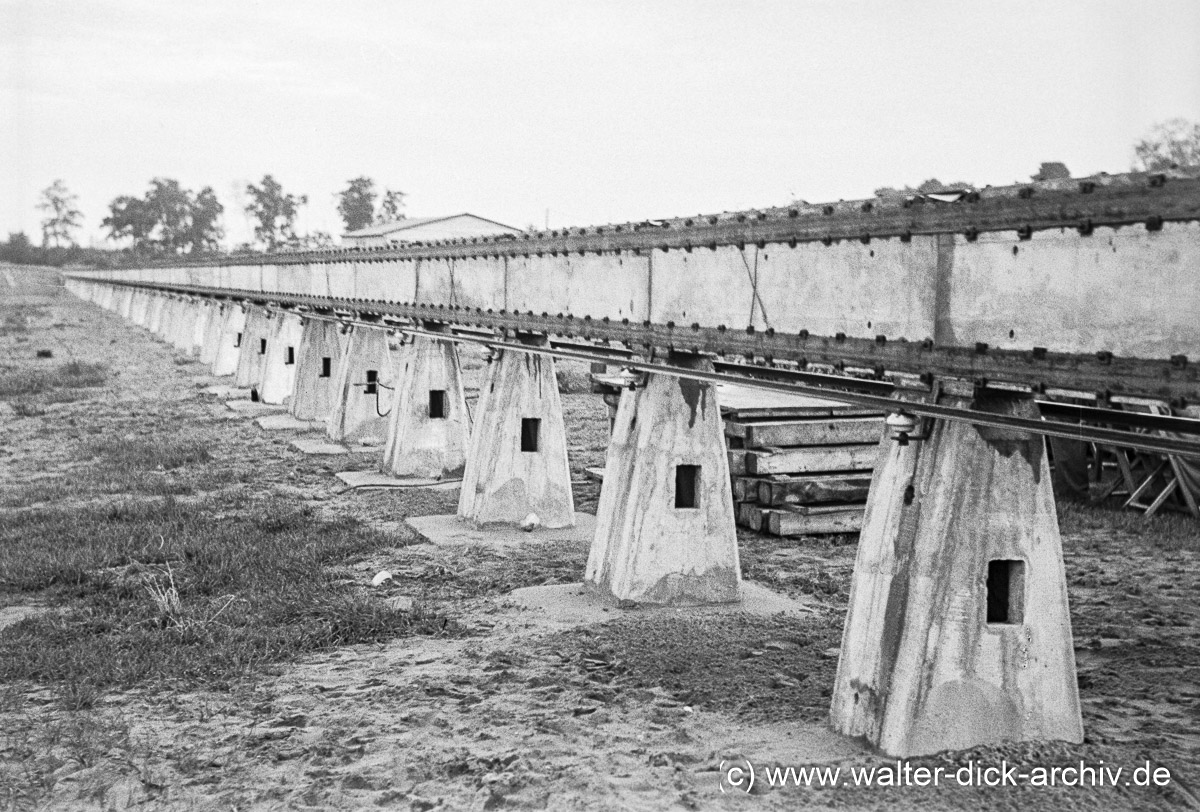 Auf diesem Foto erkennt man den aufgeständerten Fahrbalken. Für die Trassenkonstruktion wollte man auf seriell hergestellte fertigelemente aus Beton zurückgreifen, die zumindest für gerade Strecken kostengünstig in großer Stückzahl herzustellen wären.