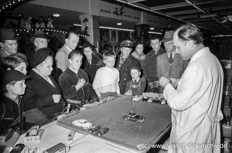 Heute (2022) in Zeiten von elektronischen Spielzeugen mit digitalisierter Fernsteuerung über Funk oder Blue Tooth wird wohl kaum noch jemand die hier gezeigten ferngesteuteten Modellautos kennen und erkennen. Aber tatsächlich war der kleine Nachbau eines Straßenkreuzers "ferngesteuert" lenkbar. Ein lange Drahtwelle verband ein kleines Steuerrad am oberen Ende mit der Lenkung im Inneren des Fahrzeugs. Angetrieben wurden die kleinen Autos meist mit einem Federantrieb, das heißt nach einer kurzen Fahrzeit musste die innenliegende Spiralfedere mit einem kleinen Schlüssel wieder "aufgezogen" werden.