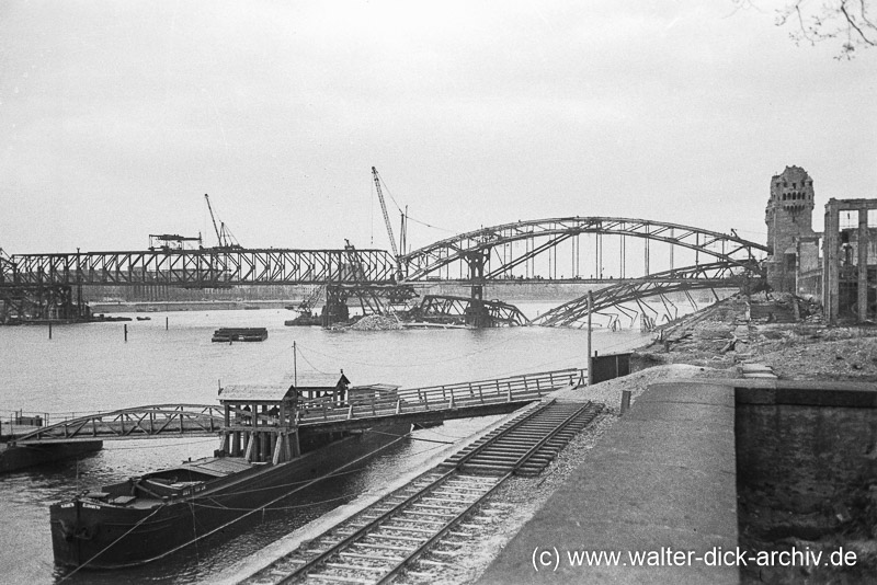 Am 6. März 1945 sprengten die zurückgehenden deutschen Truppen die beiden Strompfeiler der Hohenzollernbrücke. Dabei kippten die uferseitigen Bögen nur wenig beschädigt in den Rhein, während der Mittelteil völlig zerstört im Strom lag. In einem ersten Schritte des Wiederaubaus wurde Strommitte von den Trümmern geräumt. Zum provisorischen Wiederaufbau hob man zwei der gegenüberliegenden Bögen an und legte sie auf provisorische Strompfeiler aus massiven Stahlträgern. Die Lücke in der Mitte überbrückte man mit einer Stahlrahmenkonstruktion des Systems Schaper-Krupp-Reichsbahn (SKR), das aus relativ leichten, standardisierten Fachwerkträgern bestand, die mit Hilfe von großen Knotenblechen miteinander verschraubt wurden. Auf diese Weise konnte die Brücke im Mai 1948 wieder zweigleisig für den Verkehr freigegeben werden.Das Foto, vom Deutzer Rheinufer aus aufgenommen, zeigt die Brücke mit dem noch im Bau befindlichen Mittelteil und dem angehobenen Bogen auf der Deutzer Seite.