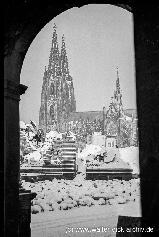 Aus einem Torbogen des Rathauses geht der Blick über die Trümmer des alte Spanischen Baus am Rathausplatz und die Ruinen der Innenstadt hin zum schneebedeckten Dom.