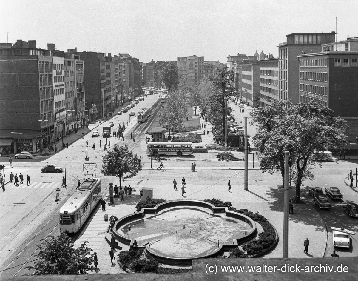 Aus einem Obergeschaoss des Eckhauses an der Hermann-Becker-Straße ist diese Aufnahme gemacht worden. Sie zeigt den Kaiser-Wilhelm-Ring in seiner gesamten Länge von Nord nach Süd. In dem Brunnenbecken im Vordergrund stand bis zum Jahre 1943 das Denkmal des ersten deutschen Kaisers Wilhelm I. Innerhalb des Wasserbeckens erhob sich auf einem ca. sechs Meter hohe Sockel das ebenfalls fast sechs Meter hohe Reiterstandbild aus Bronze. Im zweiten Weltkrieg wurde es abgerissen, um das Metall der riesigen Skulptur für Rüstungszwecke verwenden zu können.