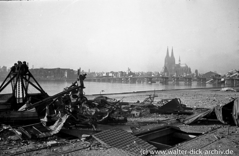 Sämtliche Rheinbrücken wurden während des Krieges zerstört. Die Mülheimer Brücke brach am 14. Oktober 1944 zusammen, nachdem ein Bombentreffer den in den Sprengkammern befindlichen Sprengstoff zur Explosion gebracht hatte. Die Südbrücke wurde am 6. Januar 1945 durch Bombentreffer zerstört. Die Rodenkirchener Brücke, die erst im September 1941 für den Verkehr freigegeben worden war, wurde im Jnauar 1945 durch Bombentreffer schwer beschädigt und stürzte am 28. Januar 1945 ein. Die Deutzer Brücke war durch Bombentreffer beschädigt, konnte aber noch benutzt werden. Am 28. Februar 1945 brach das völlig überlastete Bauwerk in sich zusammen. Die Hohenzollernbrücke wurde durch die deutsche Wehrmacht am 6. März 1945 gesprengt. Die uferseitigen Bögen wurden dabei nur wenig beschädigt.