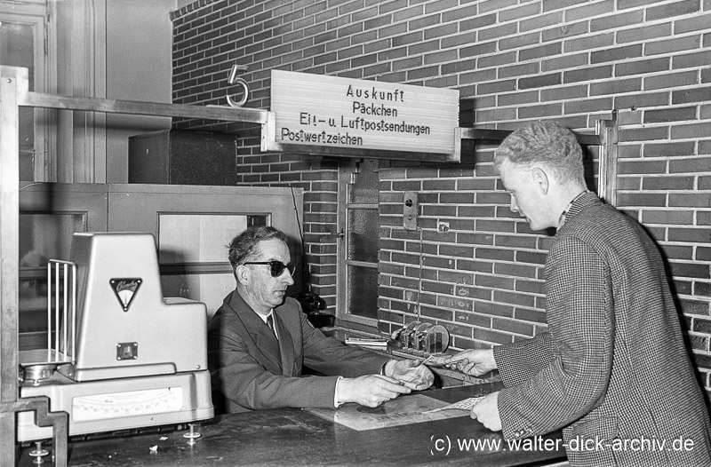 Die Deutsche Bundespost hatte nach dem Krieg auch Arbeitsplätze für kriegsblinde Mitarbeiter eingerichtet. Diese Männer, die im Krieg ihr Augenlicht verloren hatten, trugen die übliche gelbe Armbinde der Blinden mit den drei schwarzen Punkten, über denen ein kleines eisernes Kreuz aufgedruckt war. Noch in den späten 60er Jahren war in der Hauptpost Unter Sachsenhausen zumindest ein kriegsblinder Schalterbeamter tätig. Die Kunden wurden durch ein Hinweisschild darauf aufmerksam gemacht. „Hier arbeitet in Kriegsblinder. Bitte zahlen Sie möglichst mit Münzgeld!“