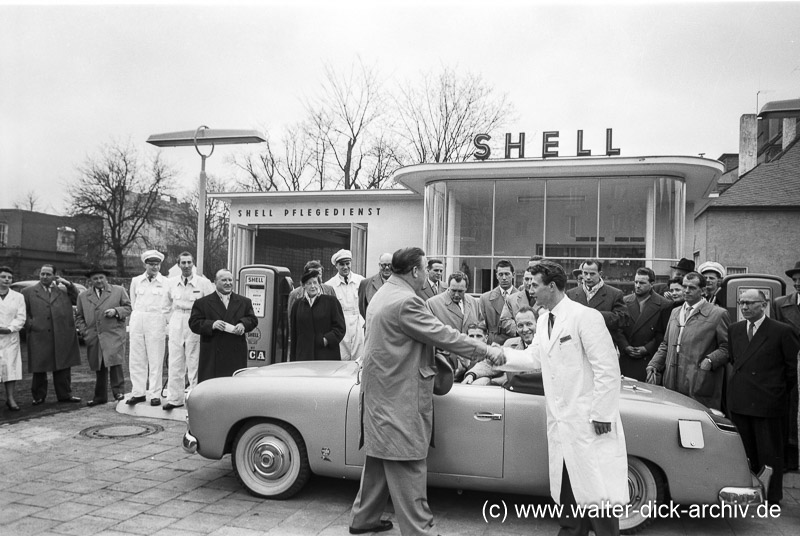 Hans Schäfer gewann mit dem 1. FC Köln 1962 und 1964 die deutsche Meisterschaft und mit der Nationalmannschaft 1954 die Fußball-Weltmeisterschaft. Er eröffnete im Jahre 1956 eine Großtankstelle an der Ecke Dürener Straße, Lindenthalgürtel/Uhlandstraße. Es kam in der damaligen Zeit häufiger vor, dass Fußballspieler nach Ende ihrer Karriere eine Tankstelle eröffneten. Andere betrieben nach der Karriere ein Sportgeschäft oder einen Schreib- und Tabakwarenladen mit Lotto-/Totoannahme. Noch zu Zeiten ihrer Karriere mussten die meisten Spieler ihren Lebensunterhalt in ihren bürgerlichen Berufen verdienen. Die Gehälter, die ein Fußballspieler in der damaligen obersten Spielklasse bezogen, waren sehr gering. Die Spieler, Vertragsspieler genannt, waren höchstens Halbprofis. Für den 1.FC Köln sind uns drei Spieler bekannt, die nach ihrer Karriere eine Tankstelle betrieben. Torhüter Fritz Ewert, Hans Sturm und eben Hans Schäfer. Schäfer; dessen Tankstelleneröffnung Walter Dick ausführlich dokumentierte, betrieb zeitweise noch eine weitere Tankstelle. Schäfer hat beide Betriebe später verpachtet und sich nach einer kurzen Trainerlaufbahn in anderen Geschäftsfeldern erfolgreich betätigt. Die Eröffnung war natürlich ein großer Werberummel, zu dem viele Spielerkollegen und die Vereinsspitze und natürlich viele Journalisten und Kameramänner kamen.