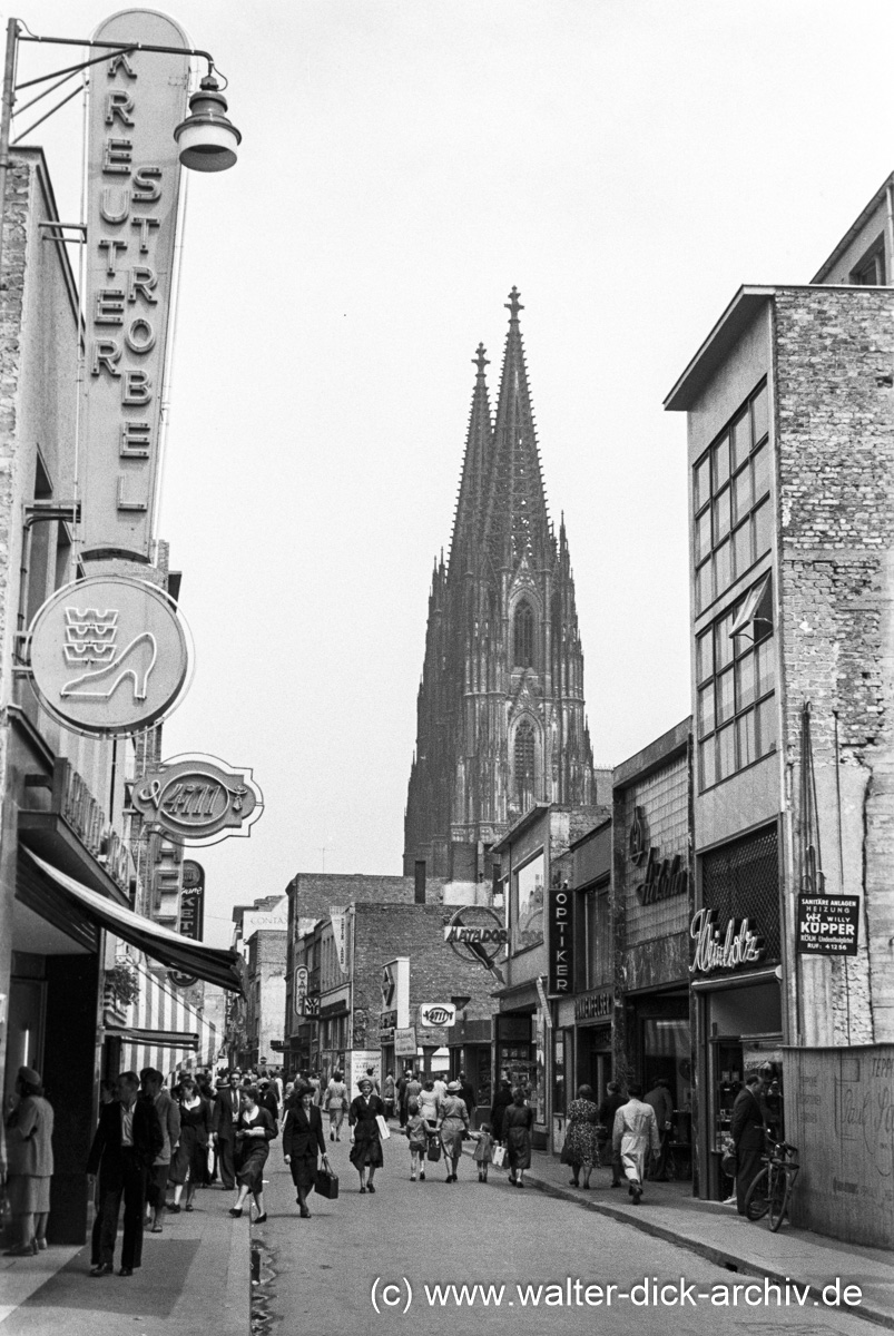 Der Wiederaufbau der Hohe Straße hat große Fortschritte gemacht, ist aber immer noch geprägt von ein- oder zweistöckigen mehr oder minder vorläufigen Bauten. Den Grundstückseigentümern und Ladenbesitzern war zunächst der Aufbau eine ebenerdigen Ladenlokals wichtig, um die Geschäfte wieder ins Laufen zu bringen. Neben barackenähnlichen Bauten waren dazu die hier vor Allem auf der rechten Seite erkennbaren Bauten mit einem oder zwei Stockwerken die ersten finanzierbaren Geschäftslokale.