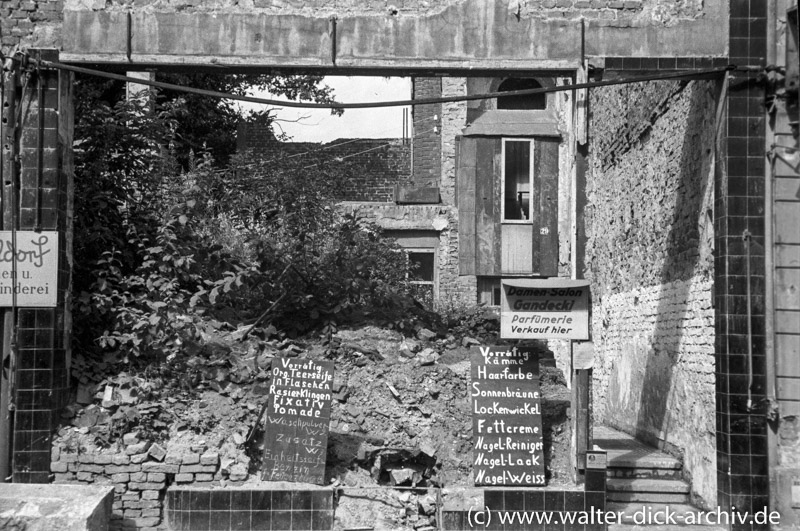 Und das Geld verlor immer mehr an Wert. In den letzten Monaten vor der Währungsreform kostete ein Eimer Rübenkraut 500 Mark und ein Pfund Butter 300. Rudolf Koller verdiente bei der Deutschen Bank damals 800 Mark im Monat. Schließlich machte er Schulden, am Tag vor der Währungsreform waren sie auf 100 000 Mark angewachsen, am Tag danach betrugen sie noch 10 000. Acht Wochen vor der Reform war in den Geschäften praktisch nichts mehr zu erhalten, erinnert sich Rudolf Kollers Sohn Rolf. ,,Danach war schlagartig alle Ware da. Das habe ich nie vergessen." Die Eltern gingen mit den Kindern sofort zu Hettlage und Kämpgen, kauften Kleider und Schuhe. ,,Aber was", fragt sich Rolf noch heute, ,,haben die Leute gemacht, die nicht so viel Geld hatten und keine Schulden machen konnten?" Eine Antwort gibt Hildegard Menge, wie Hildegard Volk heute heißt, die einen damals 18jährigen Altersgenossen zitiert: ,,Koche kann ich och! Ävver us nix jet mache, wie ming Mutter, dat kann ich nit." (Kochen kann ich auch! Aber aus nichts etwas machen, wie meine Mutter, das kann ich nicht.)