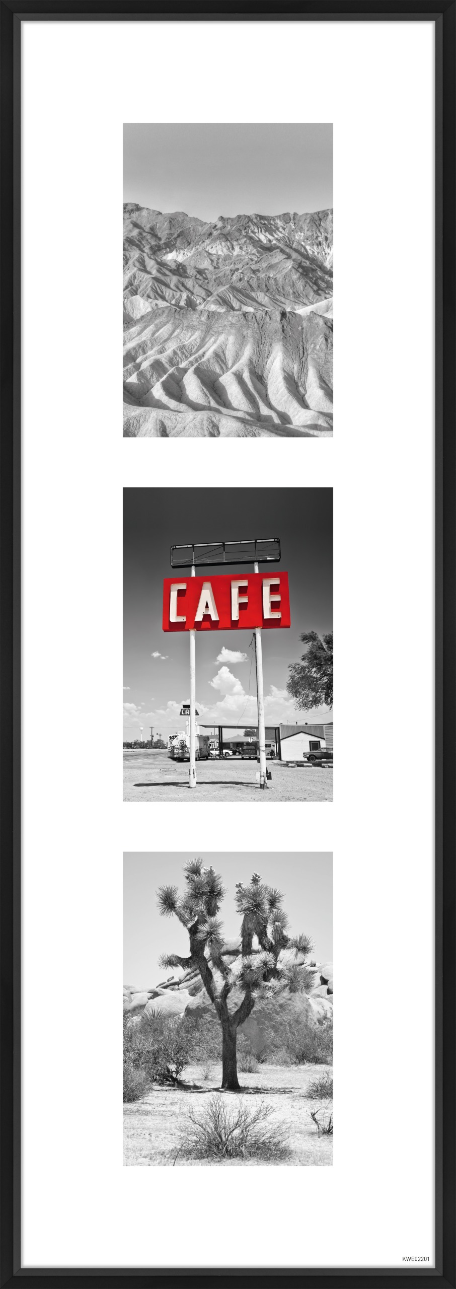 Manchmal möchte man mehr als ein Foto zusammen in einem Bilderrahmen aufhängen. Genau dazu eignet sich der Nielsen Gallery (warum er vom Hersteller Junior genannt wird wissen wir nicht). Für 3 oder 4 Fotos, im Hoch- oder Querformat und für die Formate 10x15 oder 13x18 cm. Das Profil des Gallery Junior ist auf der Innenkante abgeschrägt und in silber matt oder schwarz matt eloxiert erhältlich. Ein säurefreies hochwertiges Passepartout ist schon dabei, Sie können also direkt loslegen. Wir würden diesen Rahmen nicht für originale Kunstwerke einsetzen, aber für ein paar schöne Familienfotos oder zur Dekoration mit Urlaubsfotos zu Hause ist der Rahmen wunderbar geeignet. Wenn man das mitgelieferte Passepartout enrfernt, kann der Rahmen auch für ein kleines Panorama quer aufgehängt werden.