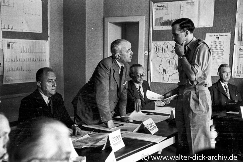 Das Foto zeigt eine Versammlung von deutschen Politikern oder Beamten mit dem englischen Stadtkommandanten Colonel White. Der britische Offizier unterhält sich mit Oberbürgermeister Hermann Pünder. Pünder und die englische Besatzungsverwaltung kamen besser miteinander zurecht, als Pünders Vorgänger Konrad Adenauer und der englische Kommandant Barraclough. Barraclough hatte im Oktober 1945 Konrad Adenauer als Oberbürgermeister entlassen, angeblich wegen Obstruktion und Unfähigkeit.