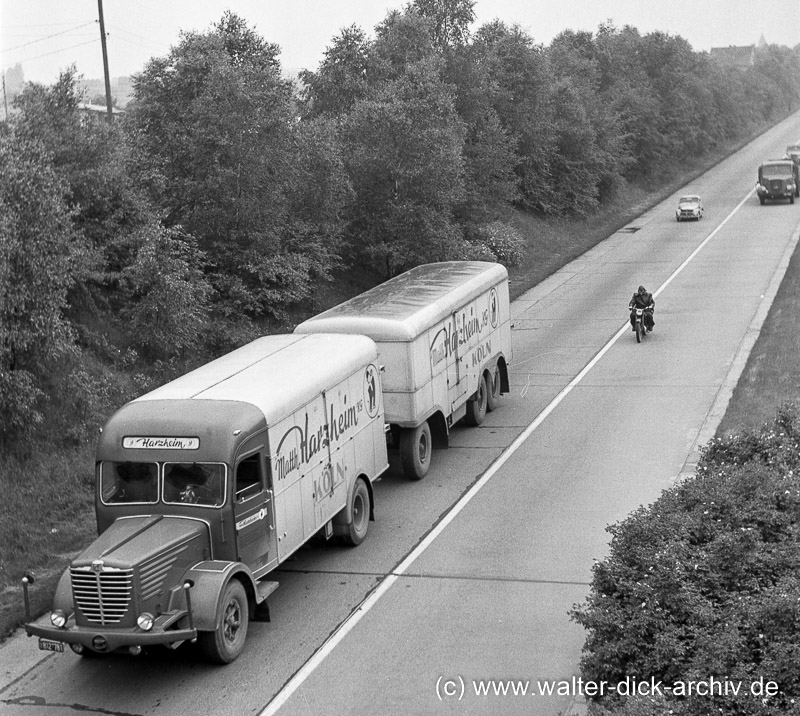 Hier ist es ein Lastzug der für die Hazheim-Gruppe unterwegs ist. Bei der Zugmaschine handelt es sich um einen Lkw der Firma Büssing aus Braunschweig, in der Vergrößerung an dem Firmenlogo auf der Fahrzeugnase, dem Braunschweiger Löwen, zu erkennen. Es ist wahrscheinlich der Typ 8000 S, der große Lkw im Fernverkehr der 50er und frühen 60er Jahre.